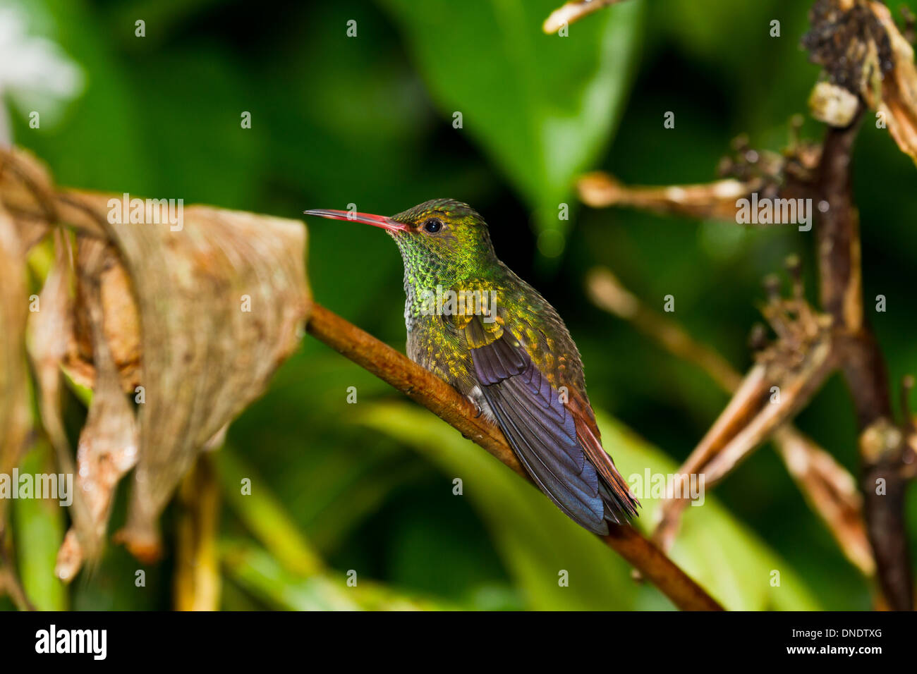 small humming bird perch on a twig in the rainforest of Belize Stock