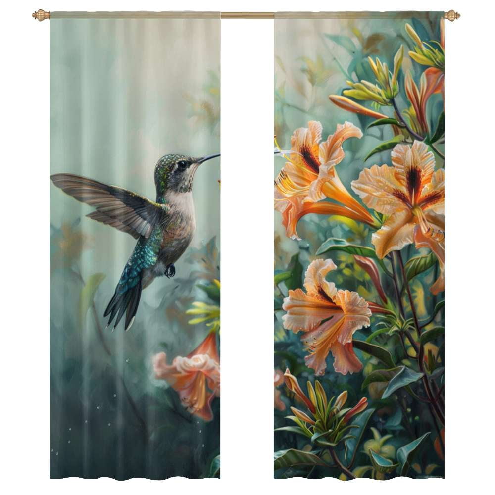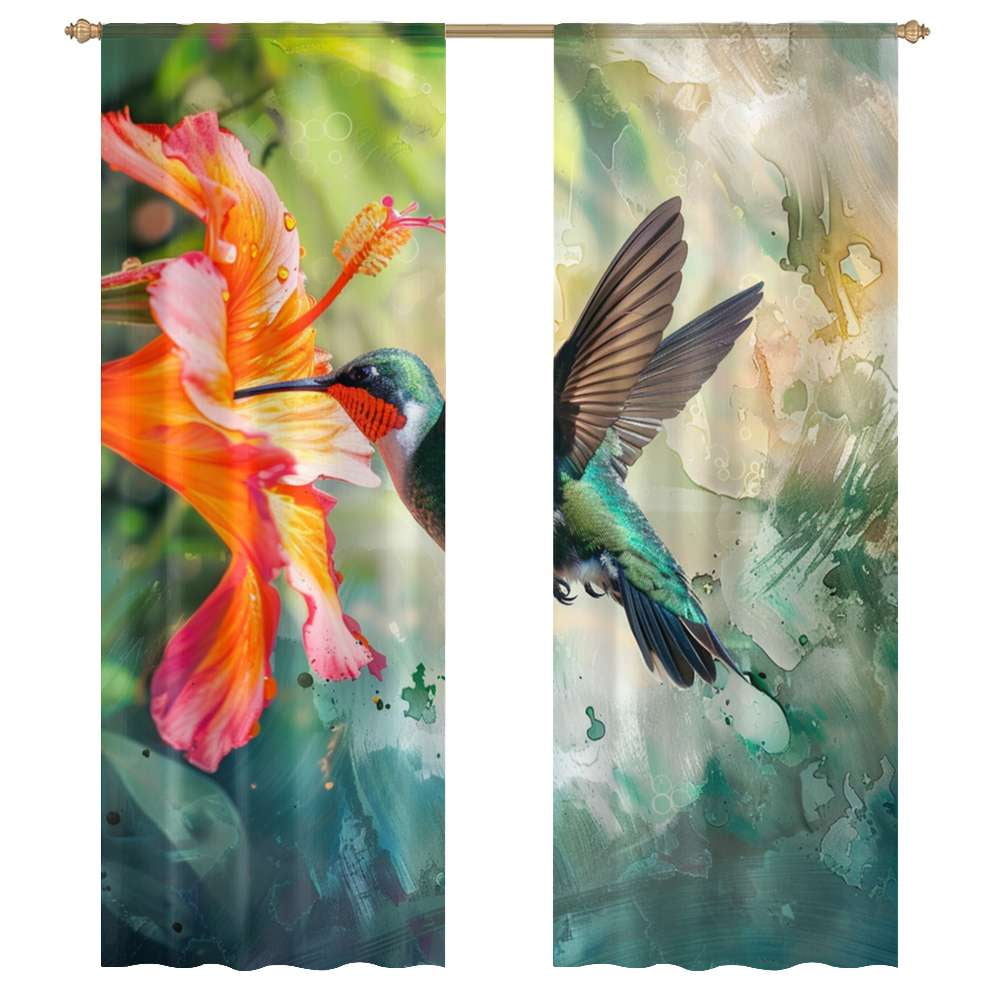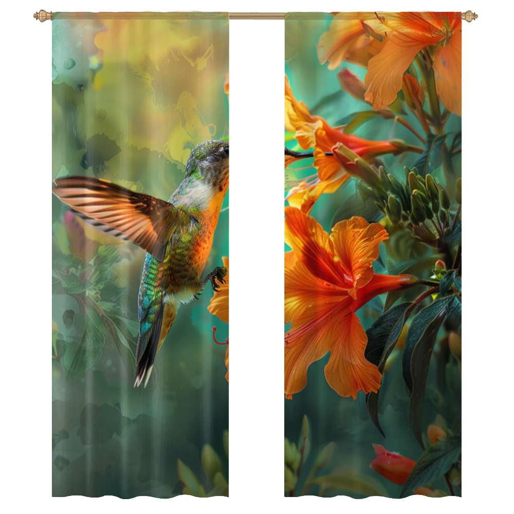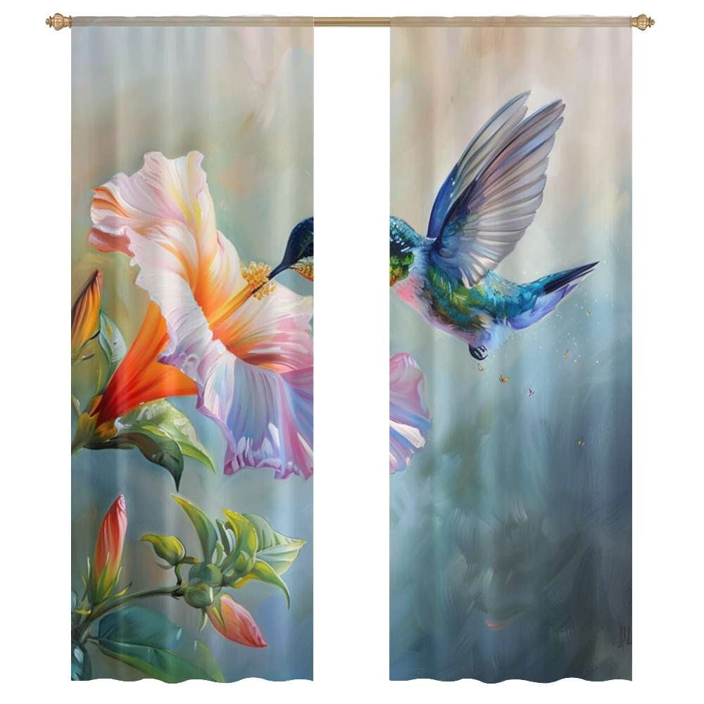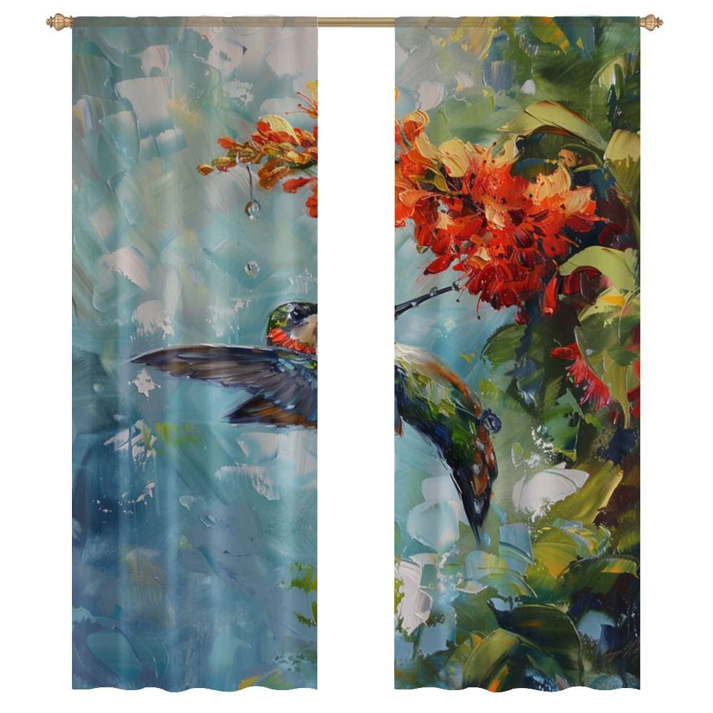 Colorful Hummingbird And Flowers Sheer Window Curtains for Living Room