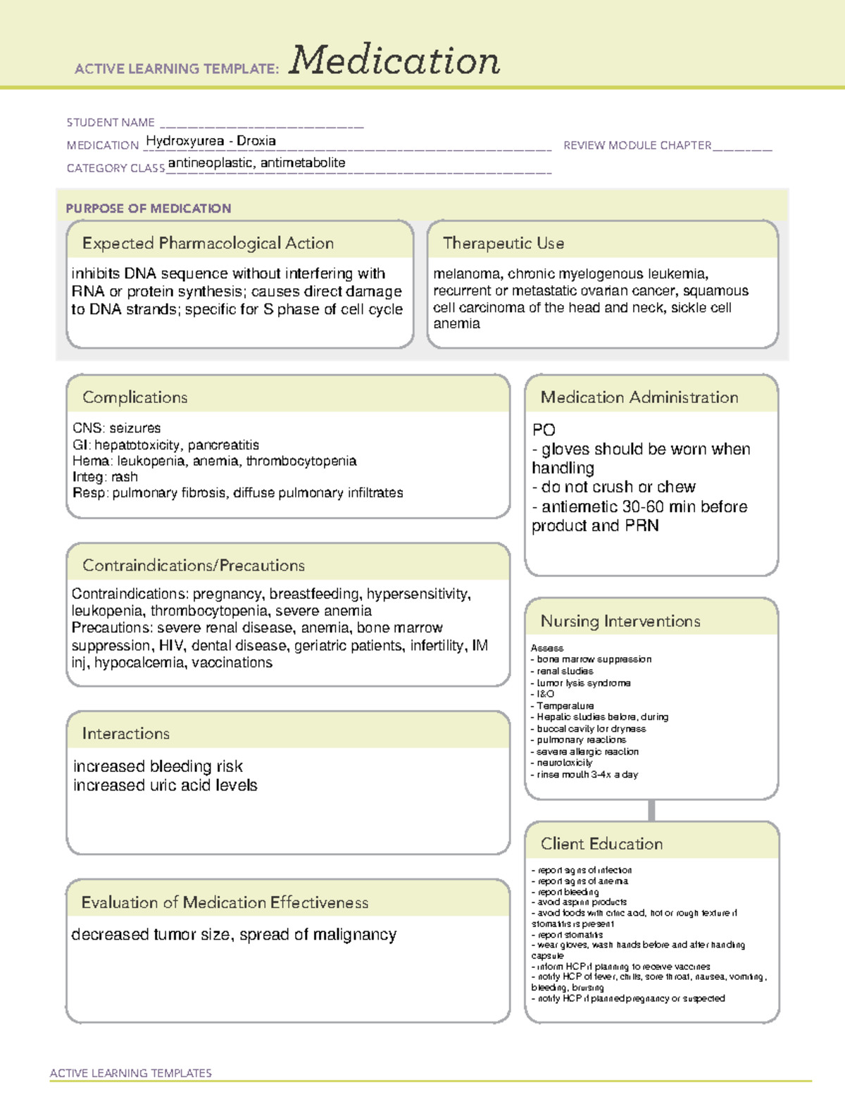 Hydroxyurea Medication Template ACTIVE LEARNING TEMPLATES