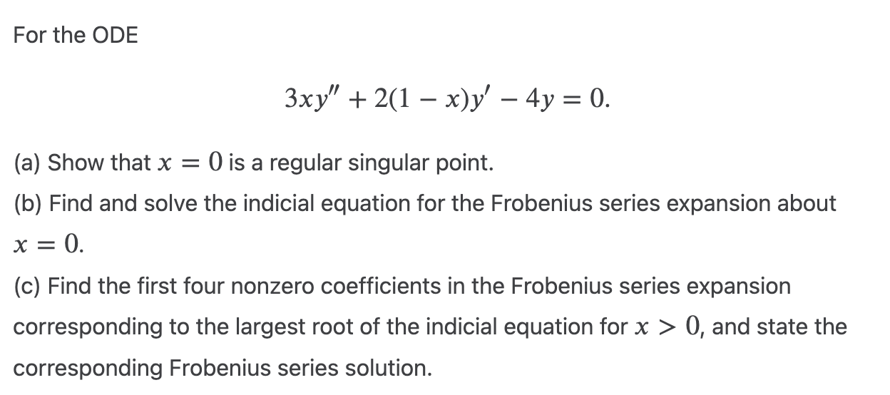Solved For the ODE 3xy′′ 2(1−x)y′−4y=0 (a) Show that x=0 is Chegg com