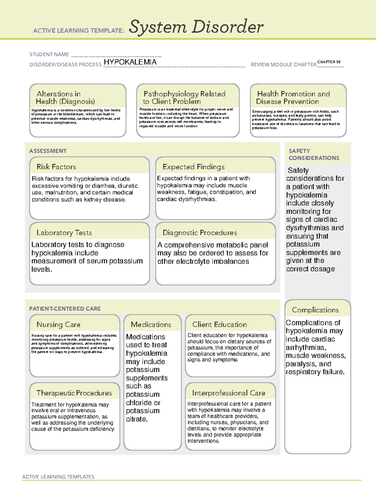 System Disorder Hypokalemia ACTIVE LEARNING TEMPLATES System
