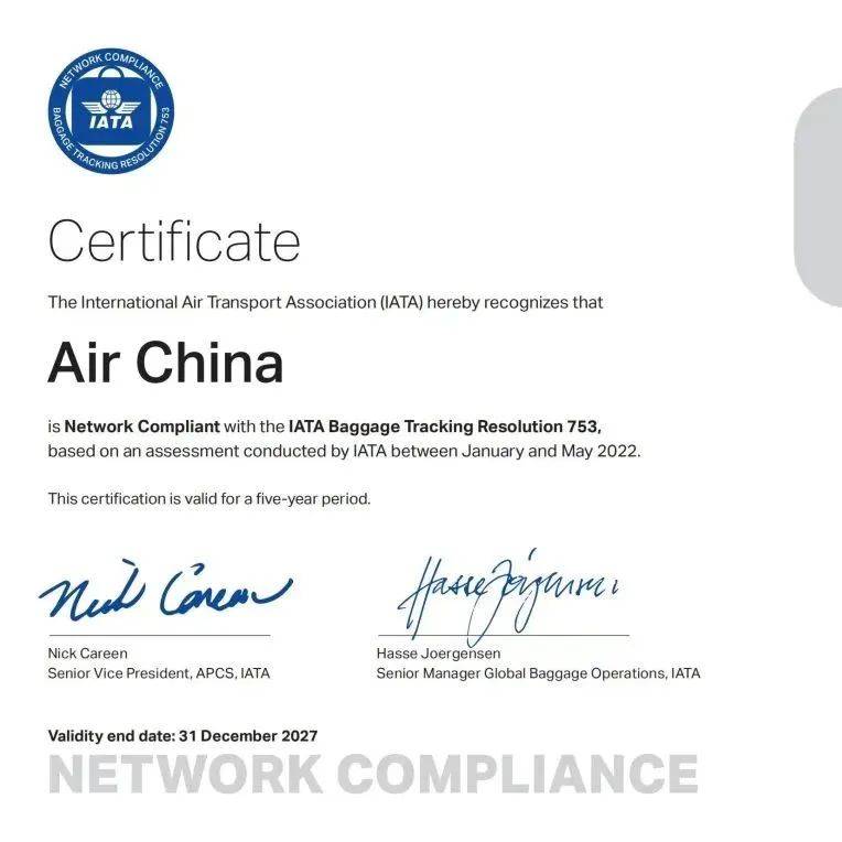 国航通过IATA行李跟踪全网络合规认证 证书 Network Baggage