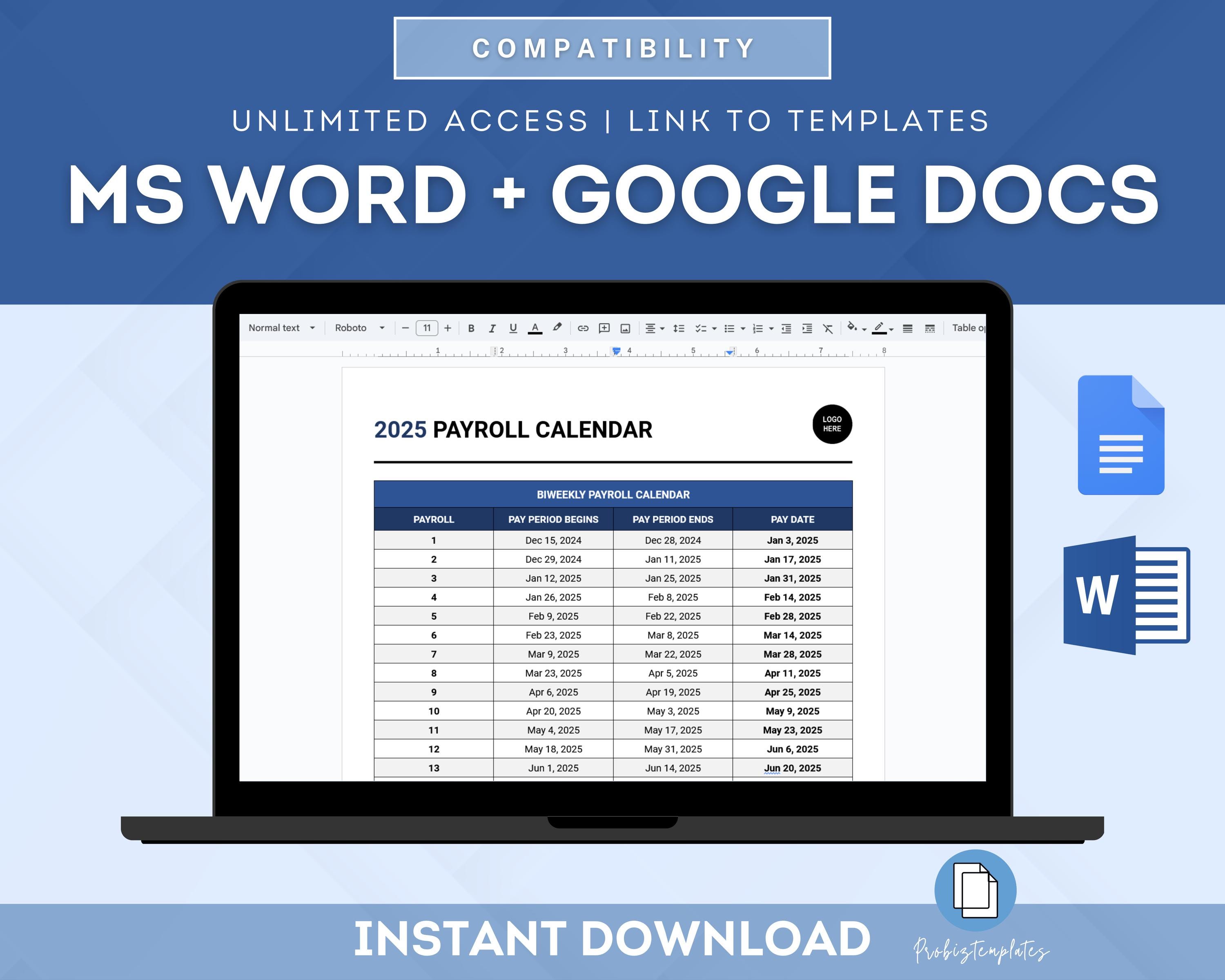 Biweekly Payroll Calendar 2025 MS Editable Word Excel Pay Period
