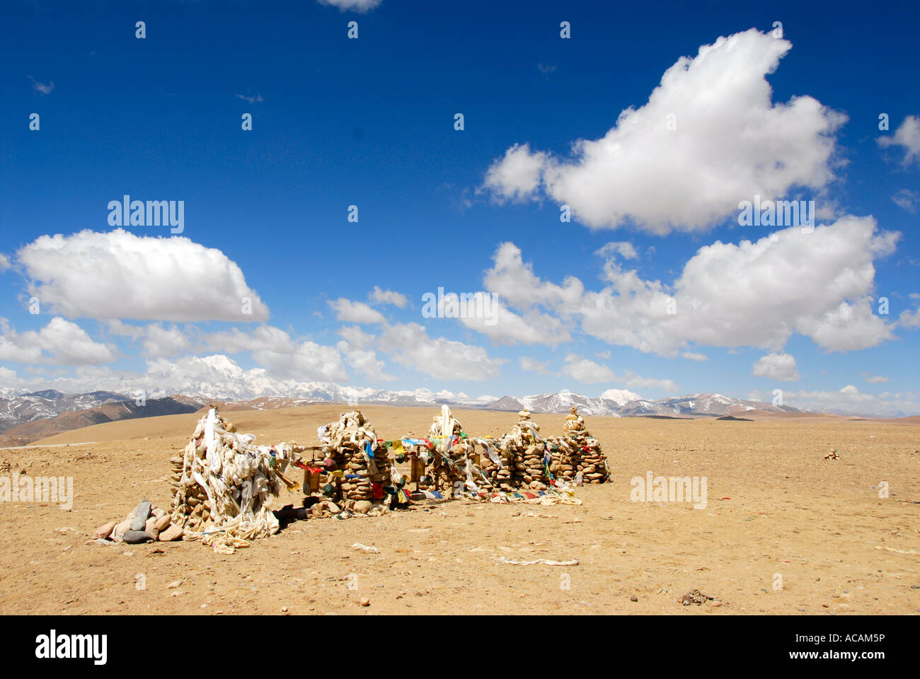 Wall with colourful prayer flags at barren wide open high plain with
