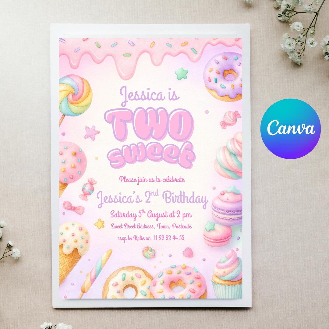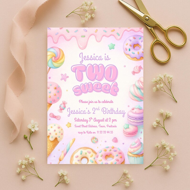 Two Sweet Birthday Invitation Girl Editable 2nd Birthday Candy Donut