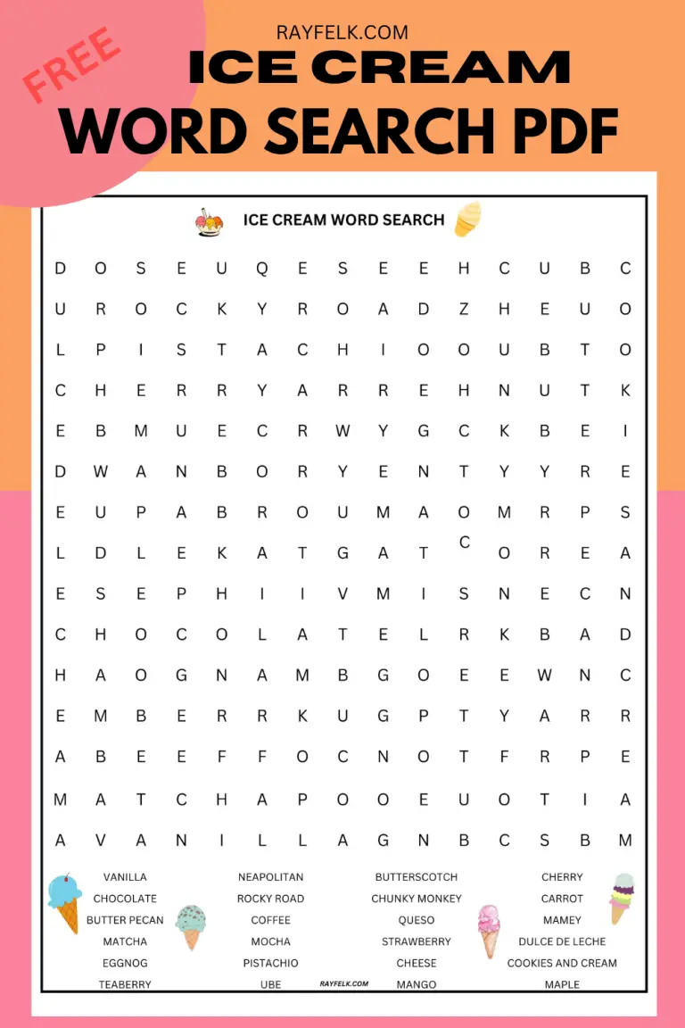 Ice Cream Word Search: Free Printable PDF with Answer Key