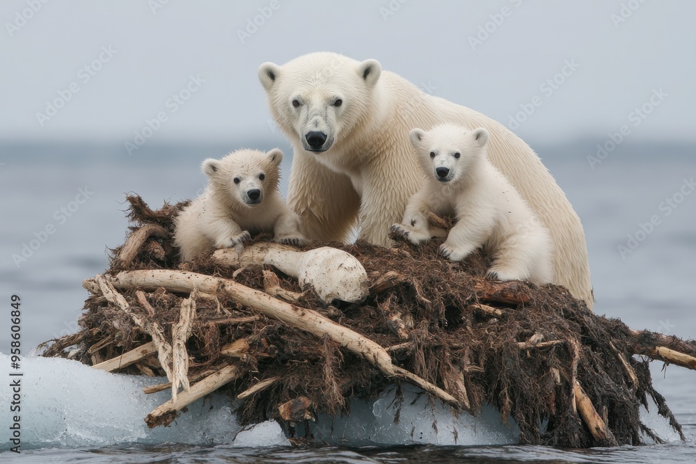 A mother polar bear and her two cubs sit on an ice raft in a cold ocean