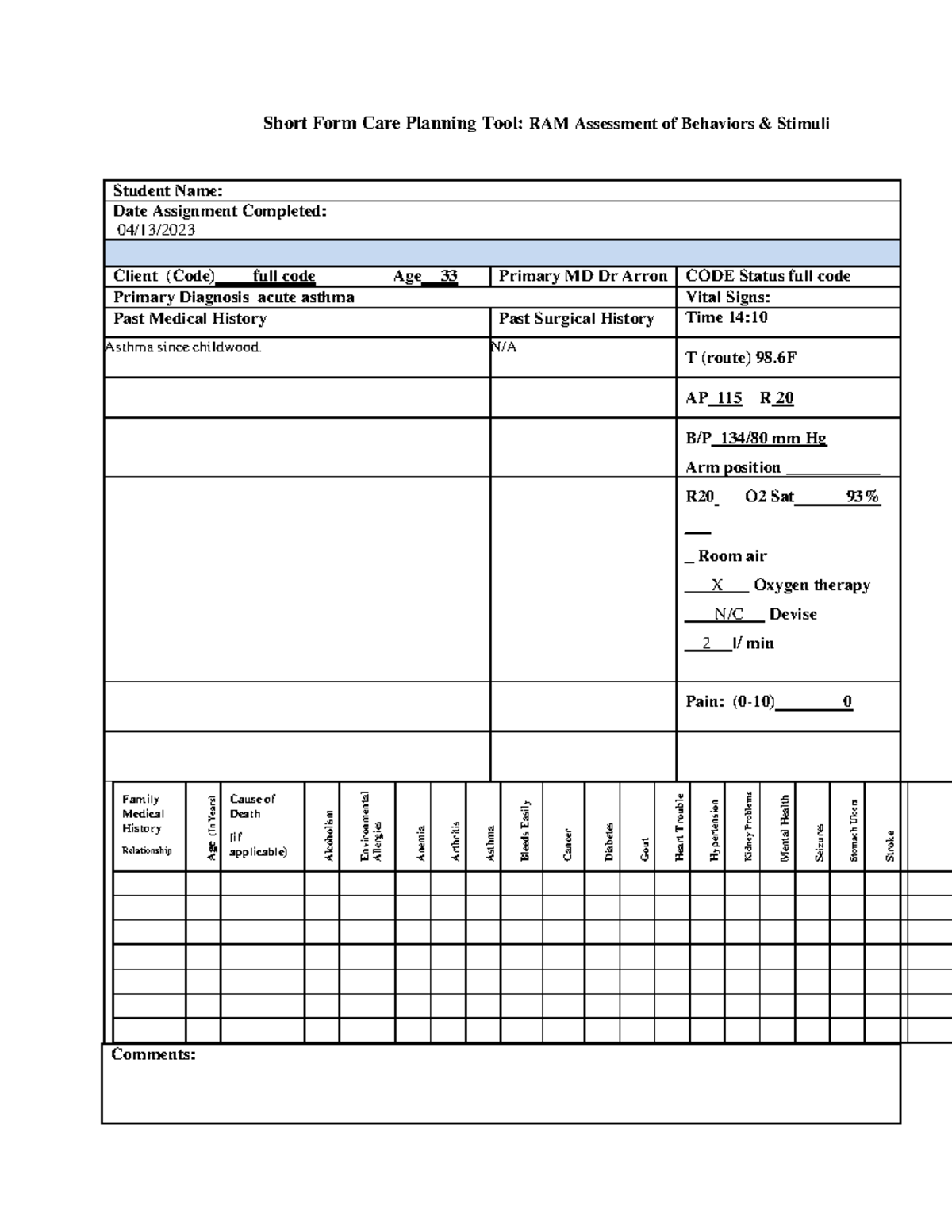 Handout Short Care Plan Form Short Form Care Planning Tool: RAM