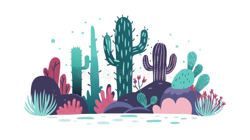 Cartoon desert cactus and rocks Plants and animals Arid hot climate