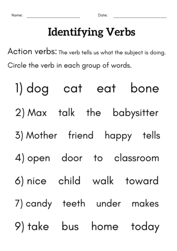 Identifying Verbs Worksheets