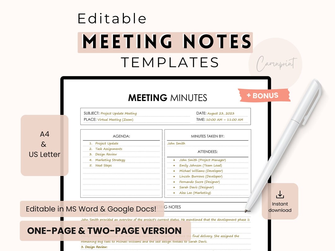 Meeting Minutes Template EDITABLE Meeting Notes Business Note Taking