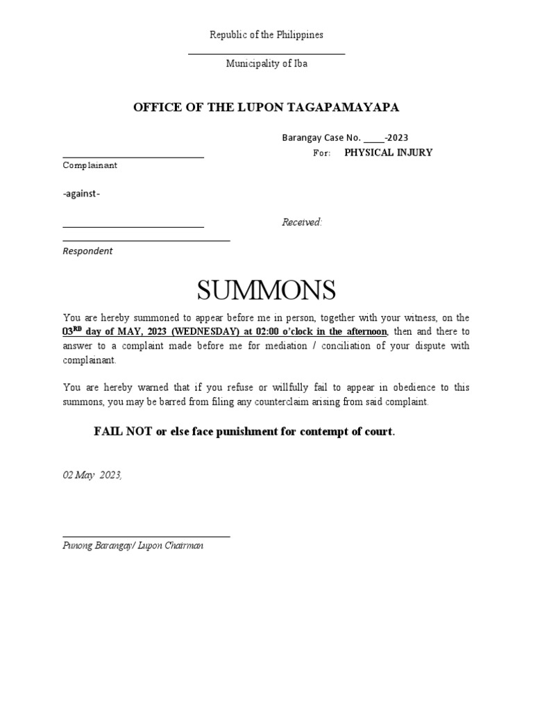 Summons: Office of The Lupon Tagapamayapa PDF