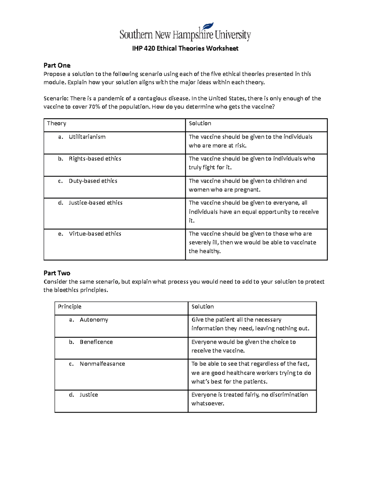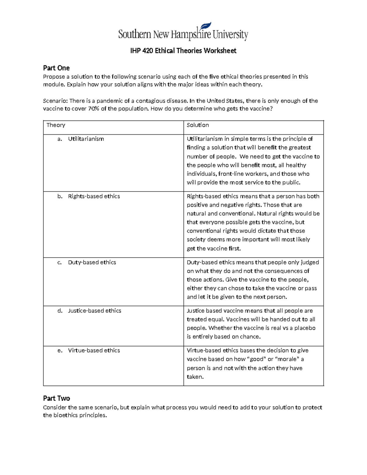 IHP 420 ethical theories worksheet IHP 420 Ethical Theories Worksheet