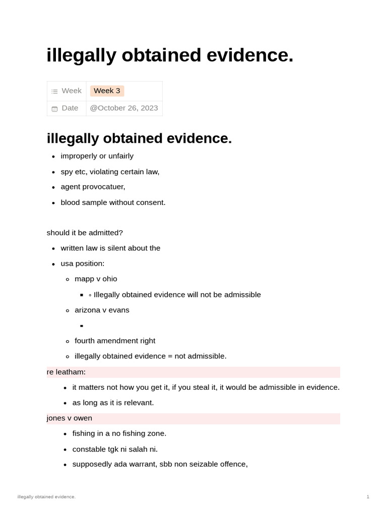 Illegally Improperly Obtained Evidence Notes LW3420 Law of Evidence
