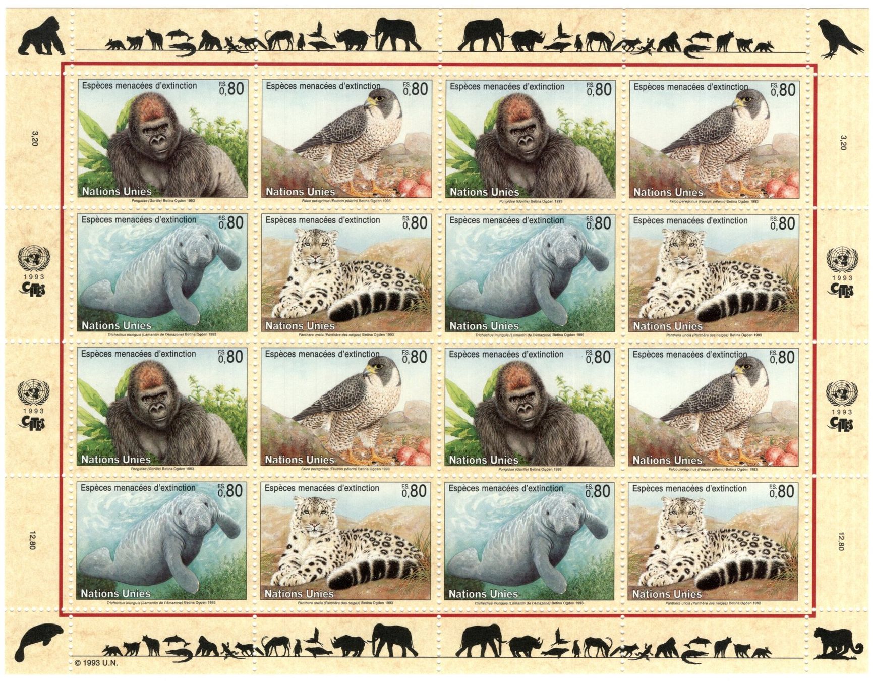1993 UNO Genf Gefährdete Tiere im KLB mit 2 ABARTEN (Neu (gemäss