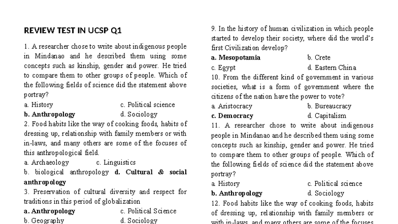 REVIEW TEST IN UCSP Q1 Lecture Notes on Social Sciences Studocu