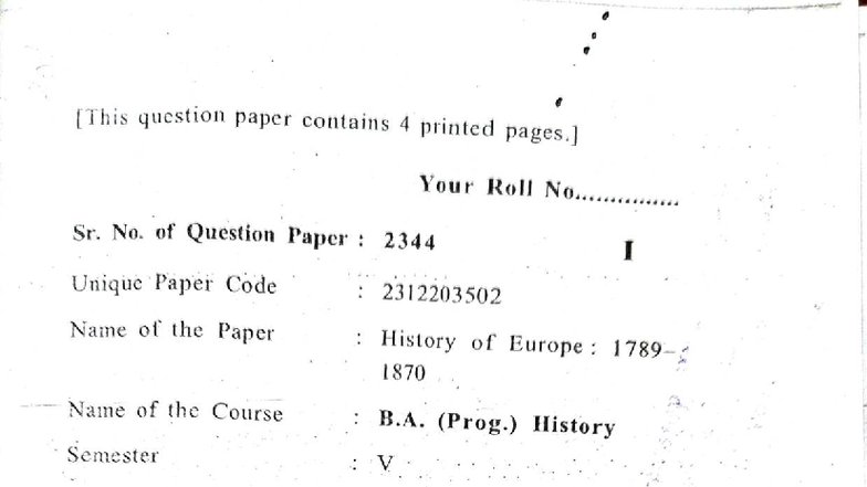 B A (Prog ) History Sem V: Question Paper on History of Europe 1789