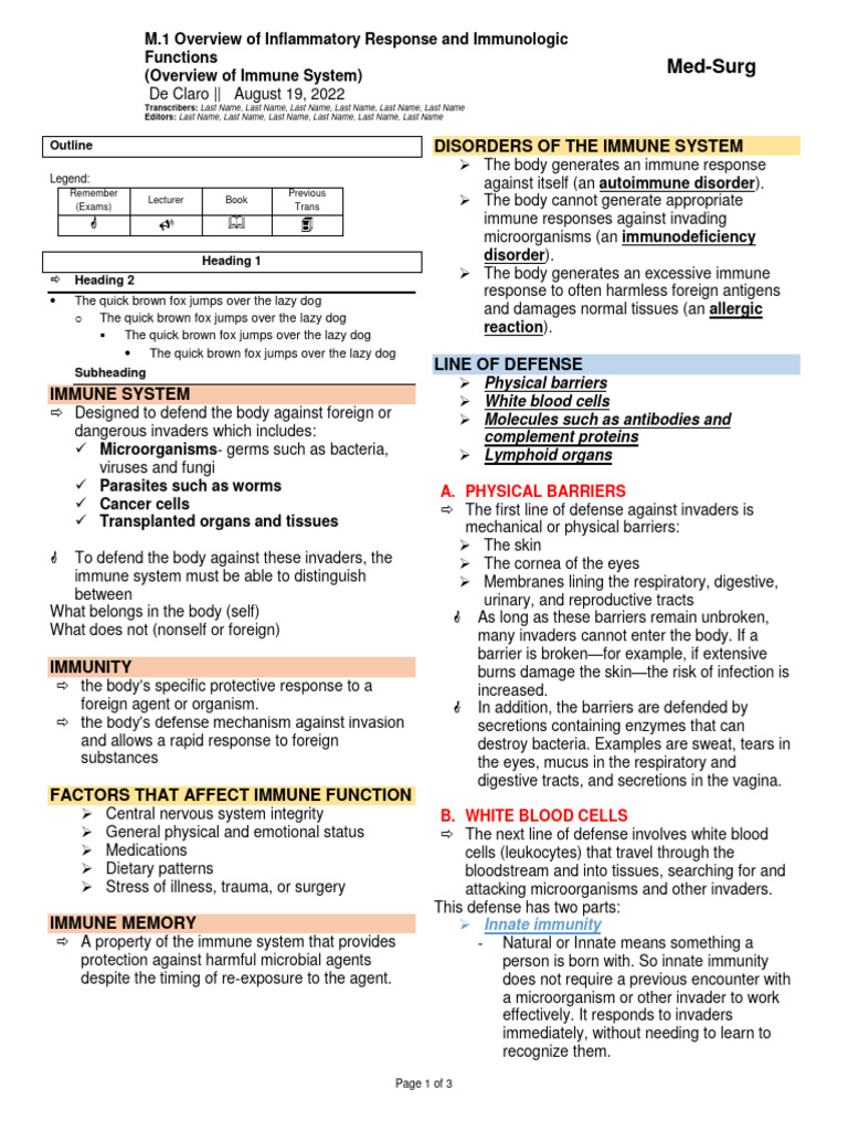 M 1 OVERVIEW OF IMMUNE SYSTEM Overview of Inflammatory Response and