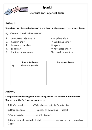 Spanish Preterite and Imperfect Tense Worksheet Pretérito