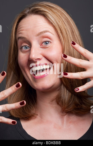 Woman smile portrait and jazz hands for dance happiness surprise and