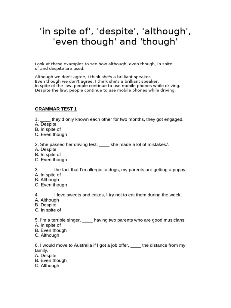 97 Printable Although Even Though Despite In Spite Of PDF Worksheets