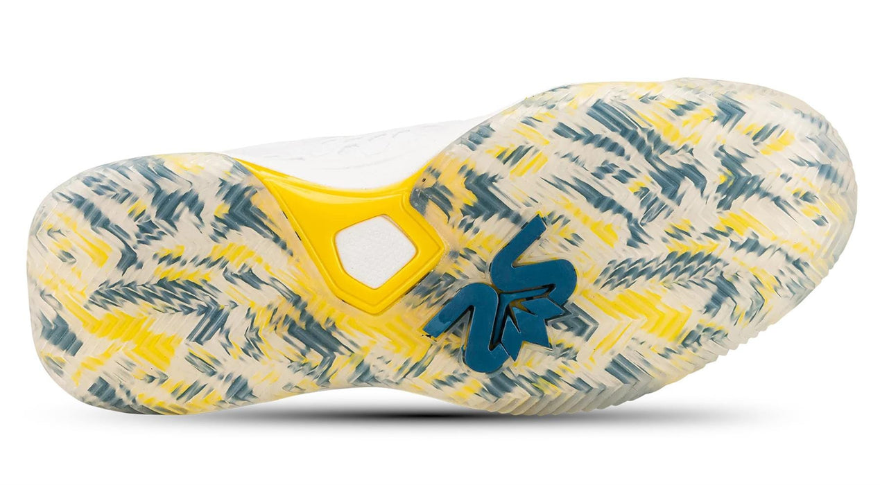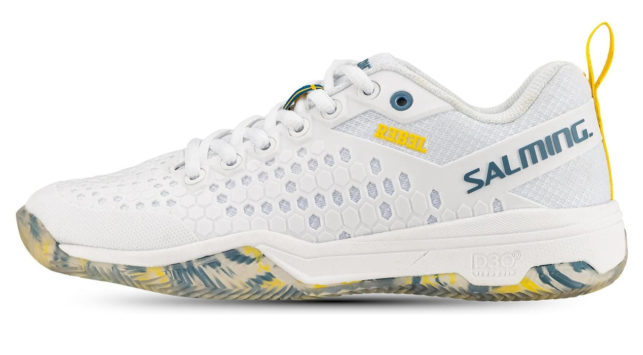Salming Rebel Mens Indoor Court Shoe White / Blue / Yellow Tennis HQ