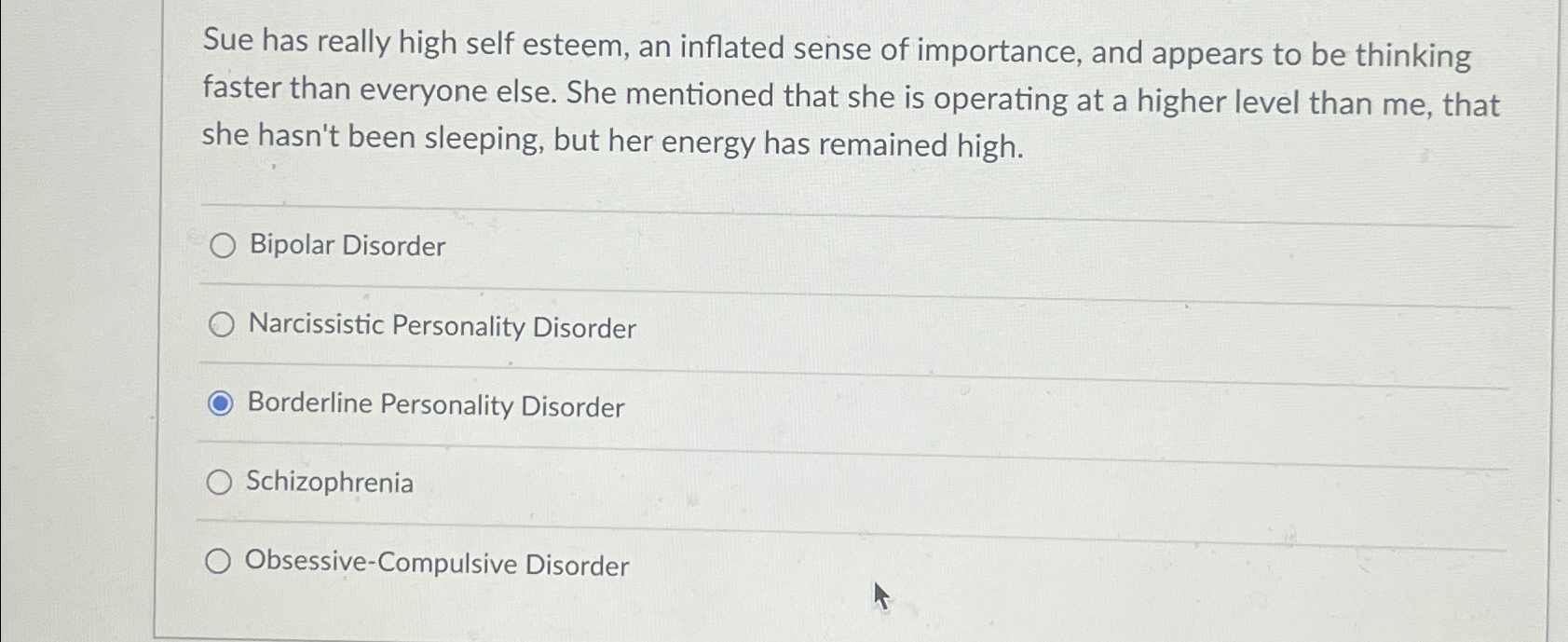 Solved Sue has really high self esteem an inflated sense of Chegg com