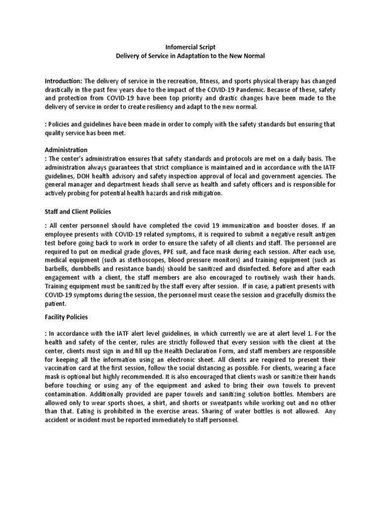 Practice Infomercial script Health Safety Protocols VOICEOVER 1