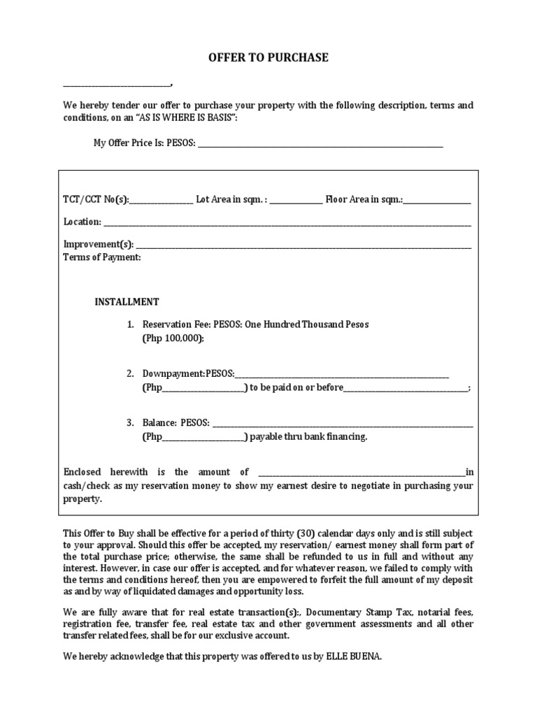 OFFER TO PURCHASE sAMPLE PDF Fee Money
