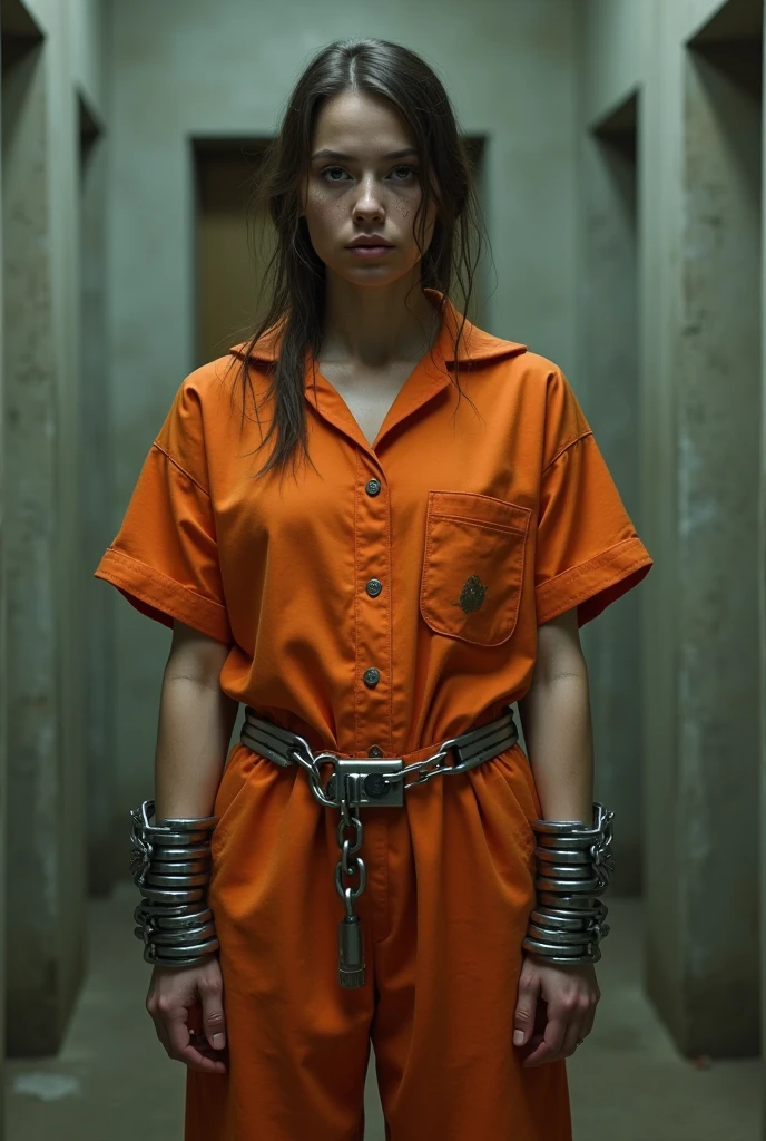 Woman inmate orange jumpsuit full body shackled SeaArt AI