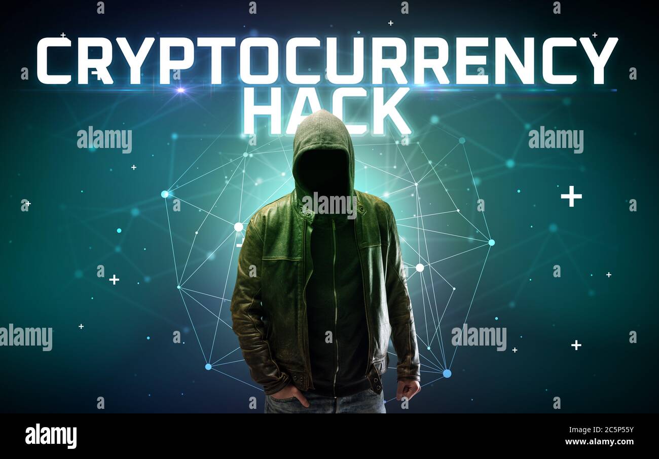 Mysterious hacker with CRYPTOCURRENCY HACK inscription online attack
