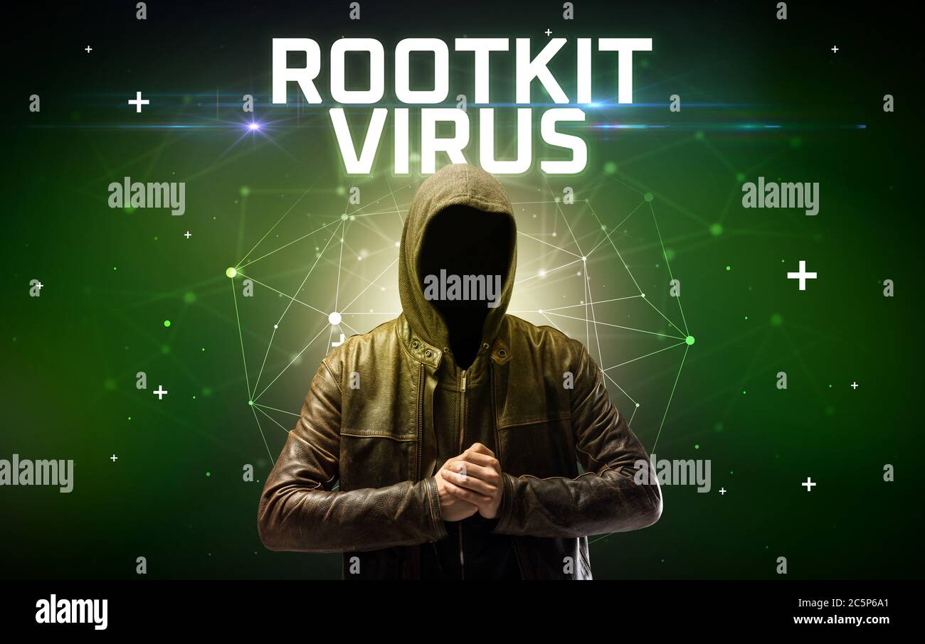 Mysterious hacker with ROOTKIT VIRUS inscription online attack concept
