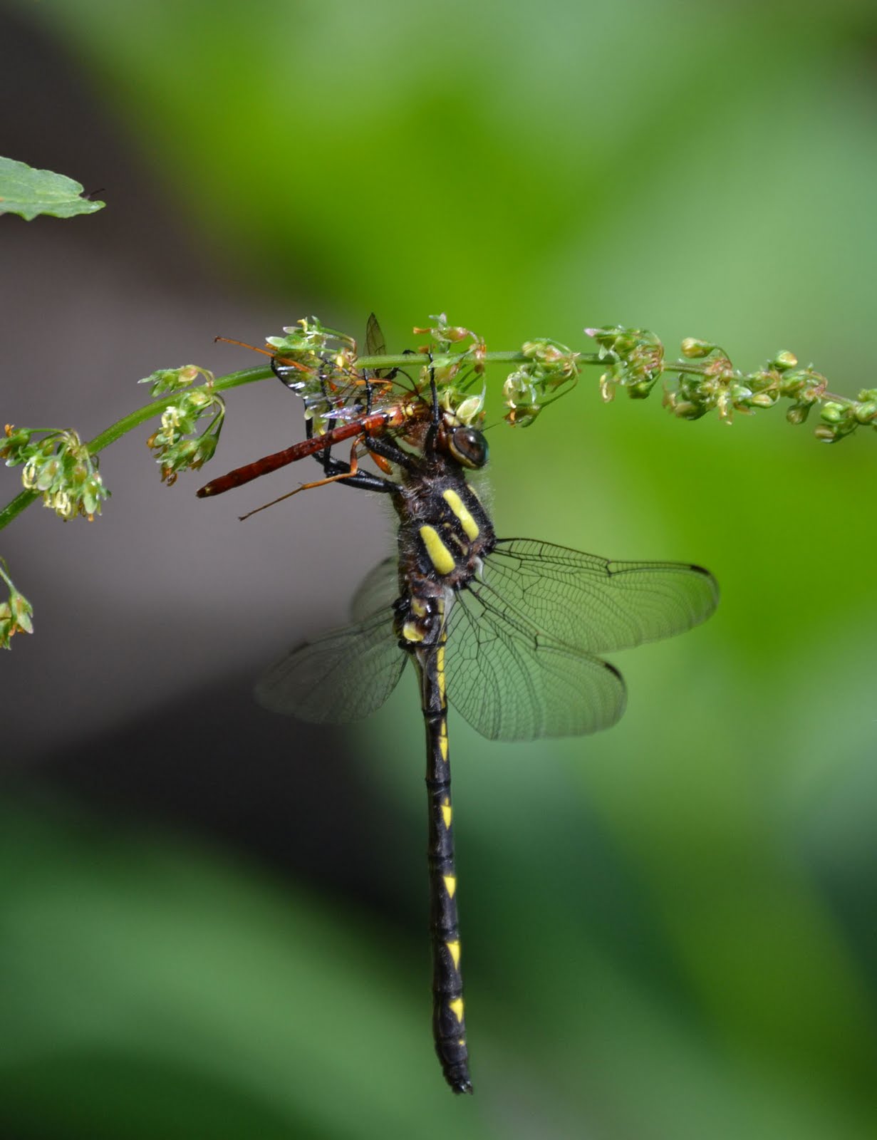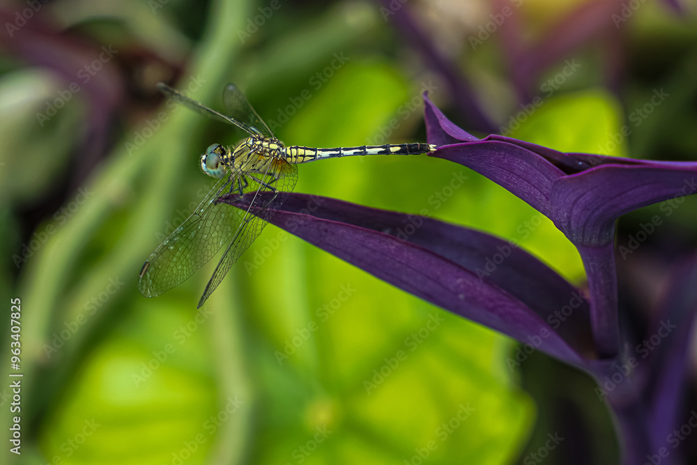dragonfly sits on an Oyster Plant leaf It is an insect whose larvae