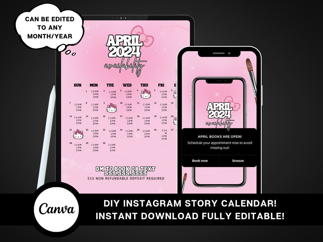 April Availability Calendar Instagram Story Calendar Book Now DIY