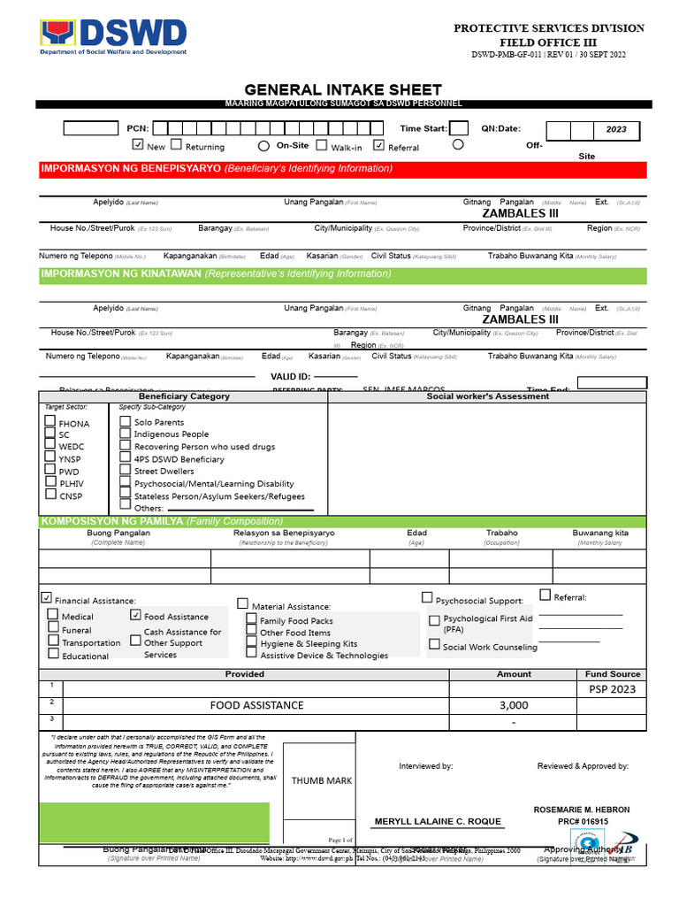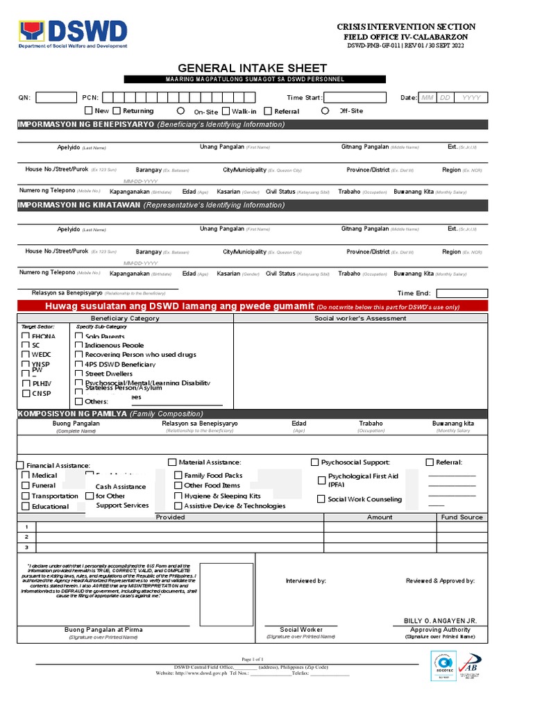 General Intake Sheet: Huwag Susulatan Ang DSWD Lamang Ang Pwede Gumamit