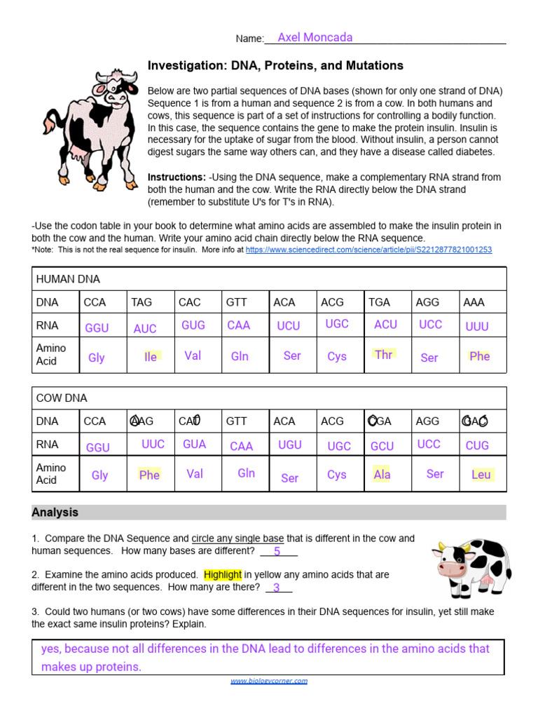 Investigation Dna Proteins And Mutations Cow Worksheet Answers