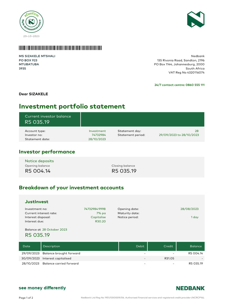 Nedbank Investment Statement 28 Oct 2023 PDF Banks Interest