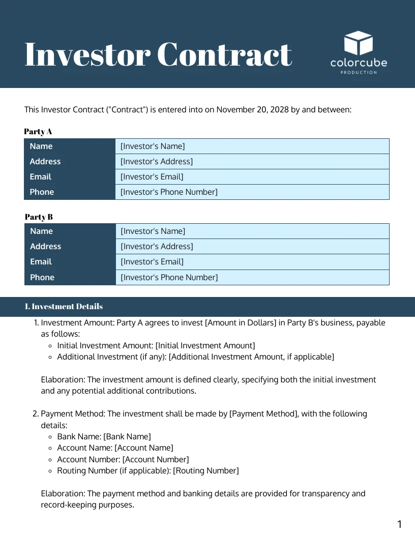 Comprehensive Investor Agreement Template Investor Contract Template