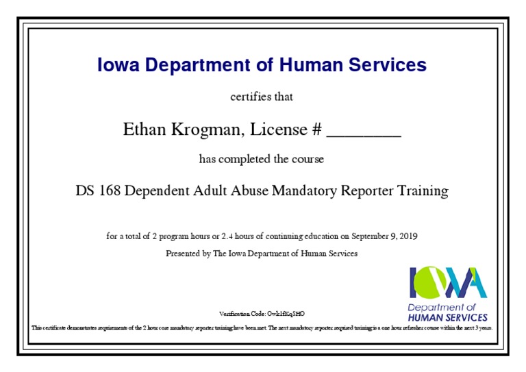 Iowa Dependent Adult Abuse Mandatory Reporter Training Certificate