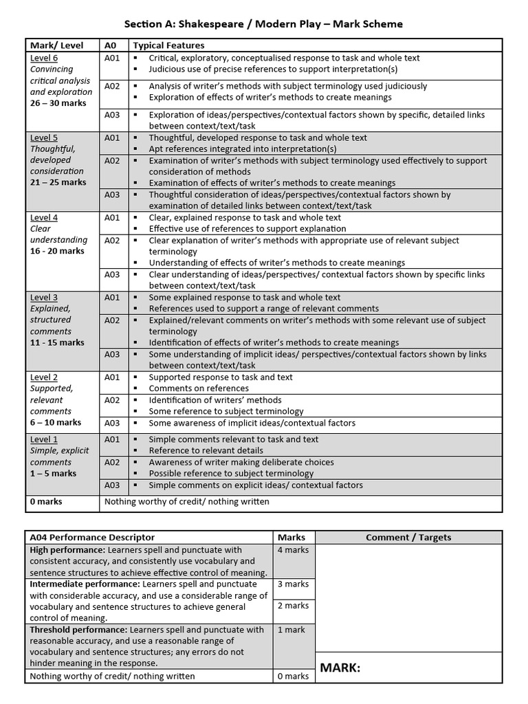 AQA GCSE Lit Shakes Modern Text Marking Sheet PDF Essays Vocabulary