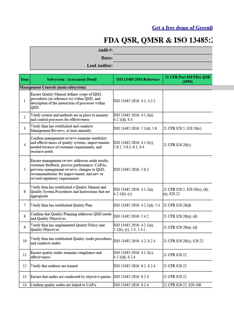 FDA QSR QMSR ISO 13485 2016 QMS Internal Audit Checklist PDF