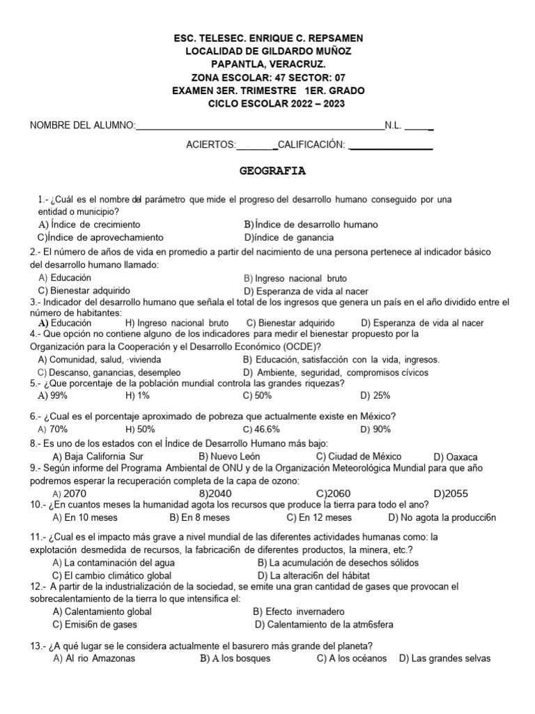 exa 3er tri 1er grado GEO PDF Entorno natural Contaminación
