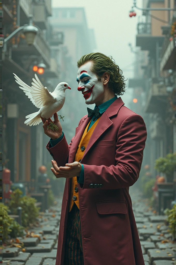 Stable Diffusion Prompt: Joker holding a dove with an olive branch