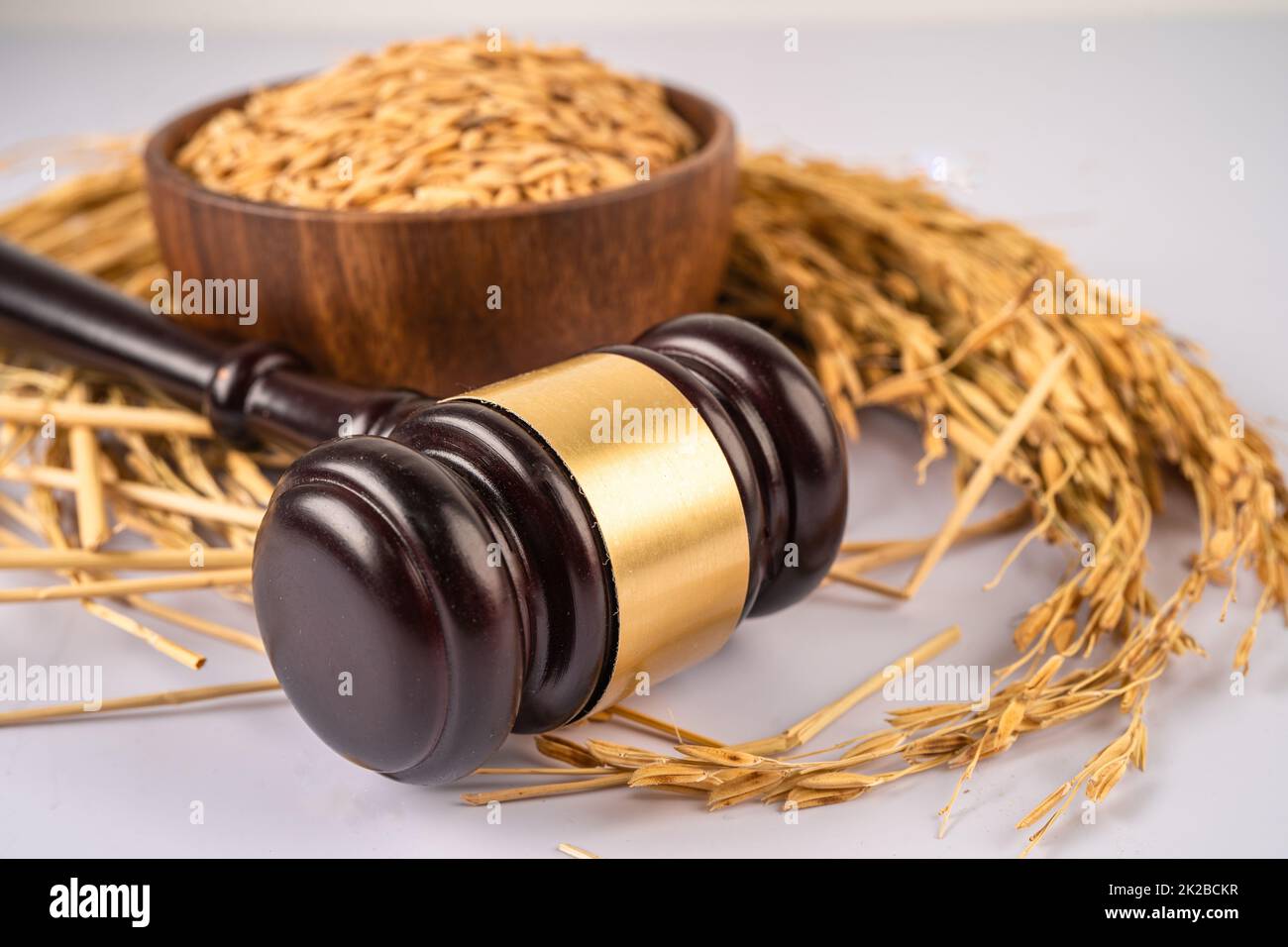 Judge gavel hammer with good grain rice from agriculture farm Law and