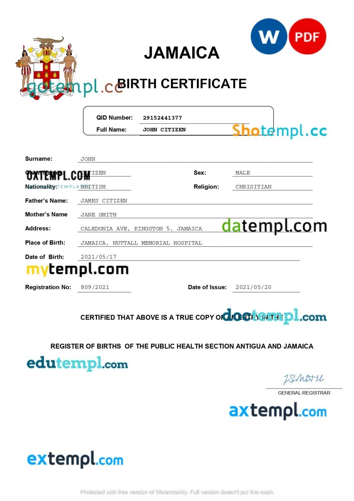 Jamaica vital record birth certificate Word and PDF template