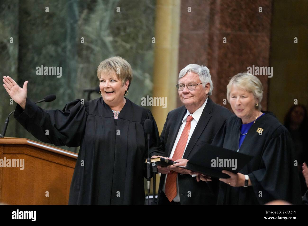 Janet Protasiewicz left is sworn as a Wisconsin Supreme Court justice