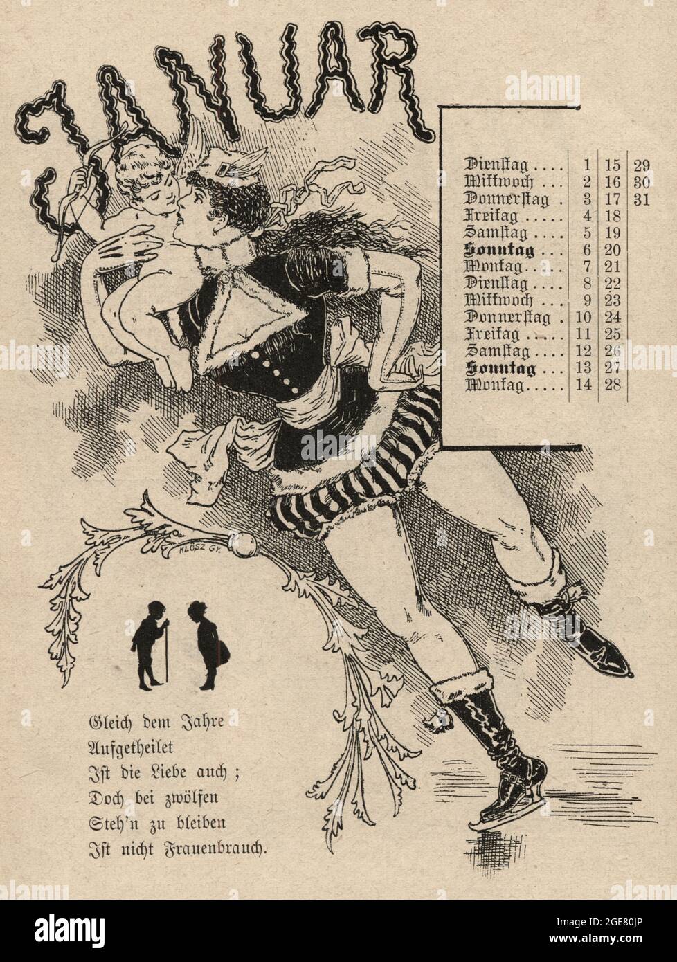 Vintage austro hungarian cartoon calendar page for January 1889 Woman