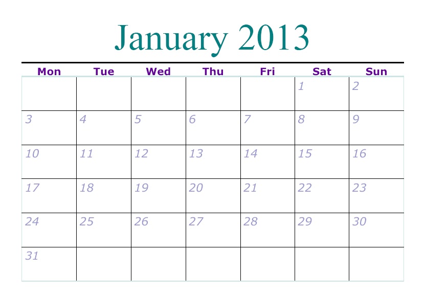 January 2013 Monthly Calendar
