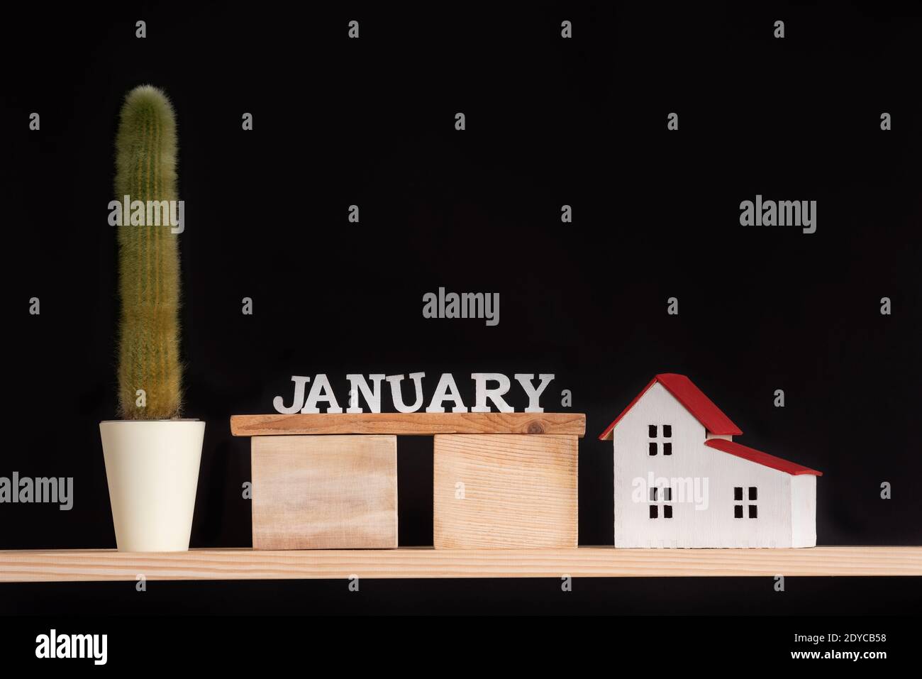 Calendar of January on white desktop flat lay with a cup of coffee and
