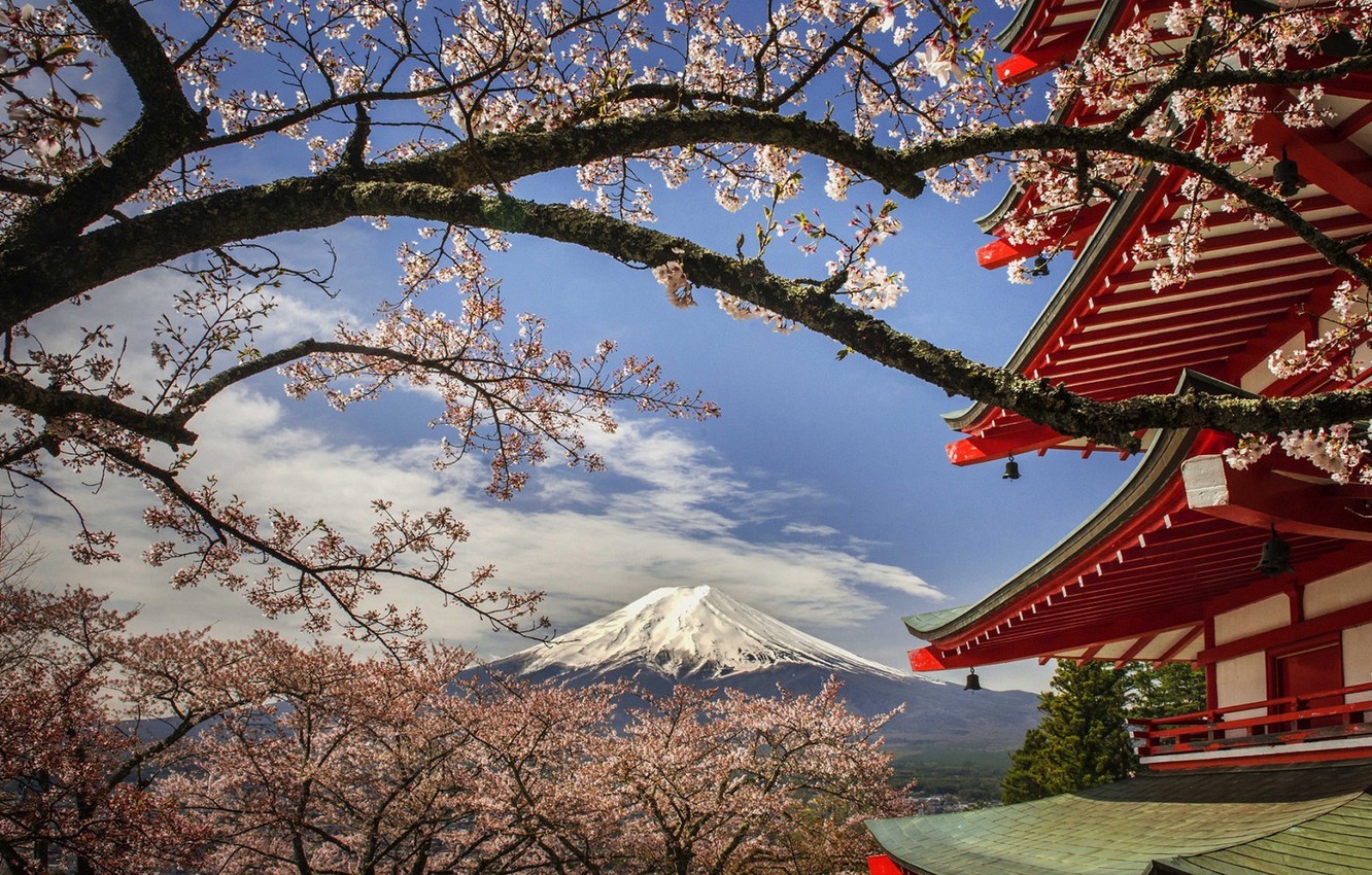 Photo Wallpaper Castle Mountain Japan Sakura Chureito Pagoda